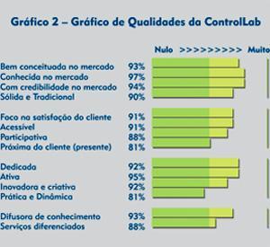 Ao avaliar a Controllab os clientes demonstraram alto nível de satisfação em geral, registrados entre 81% e 97%, como demonstrado no Gráfico 2. No quesito acessível e inacessível, por exemplo, 91% dos respondentes classificaram-na como acessível (ou muito acessível). Merecem destaque, ainda, quesitos como credibilidade (94%), pró-atividade (95%) e reconhecimento no mercado (97%).