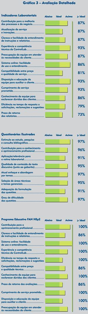 Na pesquisa detalhada apresentada no Gráfico 3, todos os requisitos analisados obtiveram avaliação entre ideal e acima de ideal, com média de 86% em Indicadores Laboratoriais, 96% em FAN HEp2 e 95% para os Questionários Ilustrados relançados este ano em novo formato.