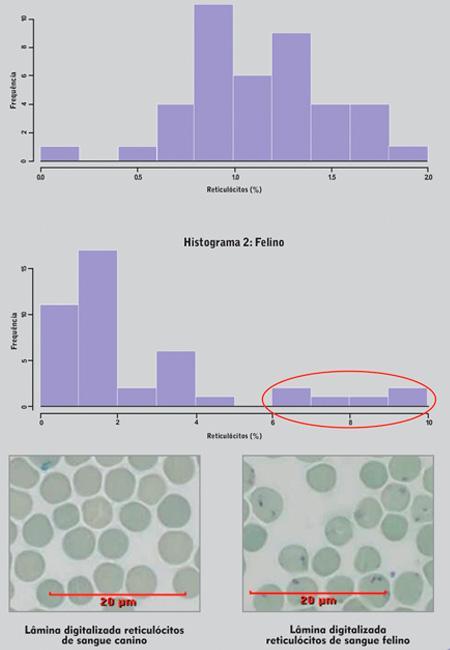 Outro ponto importante que deve ser levado em consideração é a classificação dos reticulócitos nos felinos. Os gatos representam uma espécie particular de animais, pois possuem 2 (dois) tipos de reticulócitos: agregados (ou aglomerados) e pontilhados (ou puntiformes). Os reticulócitos agregados evoluem para a forma de pontilhado em aproximadamente 12 horas. Devido a esse curto período de maturação dos reticulócitos agregados, essas células são os melhores indicadores de liberação medular ativa. Portanto, apenas os reticulócitos agregados são contados em gatos. Nas figuras 1 e 2 é possível visualizar a diferença entre os reticulócitos das duas espécies, observando também duas populações distintas na figura 2.